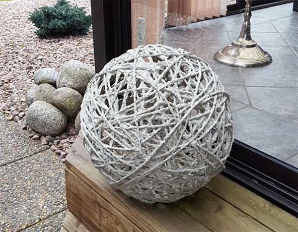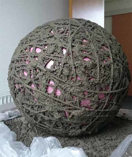 Для работы нам нужен раствор цемента — замешиваем густой раствор 1 часть песка, 1 часть цемента.Погружаем в раствор веревку, это также могут быть полоски из старой футболки и т.п. Надуваем воздушный шар, подготавливаем для него подставку, где он будет сохнуть. Это может быть обычное ведро.Обматываем шар веревкой в цементном растворе.