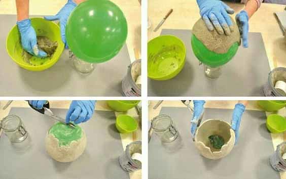 Берем, все тот же воздушный шарик и покрываем его цементным раствором. Здесь можно в раствор добавить столовую ложку гипса, только работать надо быстро.