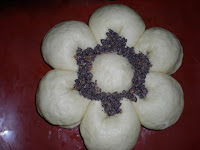 Чтобы сделать лепестки, нужно раскатать шар в круг толщиной не менее 1 см. Положить сверху 1 ст.л. начинки. Начинки должно хватить на 6 лепестков и остаться для украшения пирога.