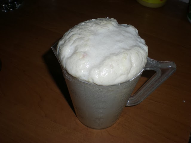 В теплом молоке развести дрожжи, добавить столовую ложку сахара и пару столовых ложек муки. Накрыть посуду и оставить на 10-15 минут до образования пышной шапки.