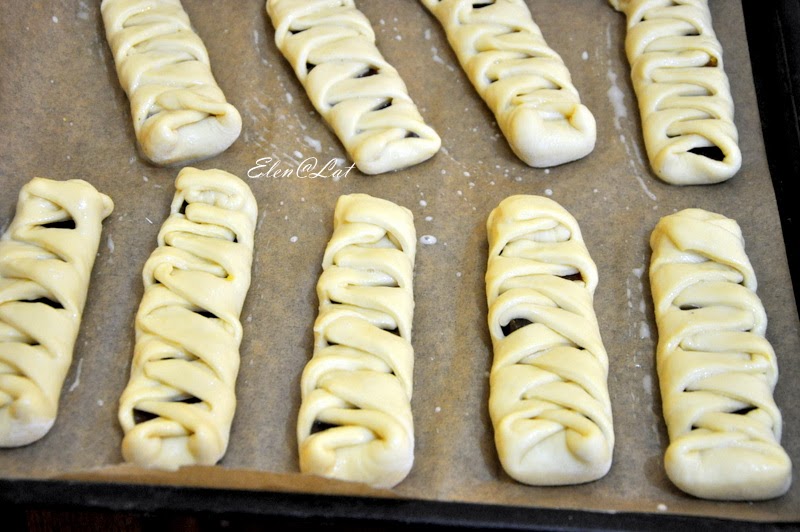 Косички выкладываем на противень, застеленный пергаментом и оставим в теплом месте на расстойке минут на 20. Затем косички смазать взбитым яйцом и выпекать в заранее нагретой до 180°С духовке до золотистого цвета.