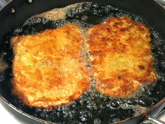 В сковороде или сотейнике разогреваем на средне-сильном огне растительное масло. Обжариваем на нем отбивные примерно по две минуты с каждой стороны.
