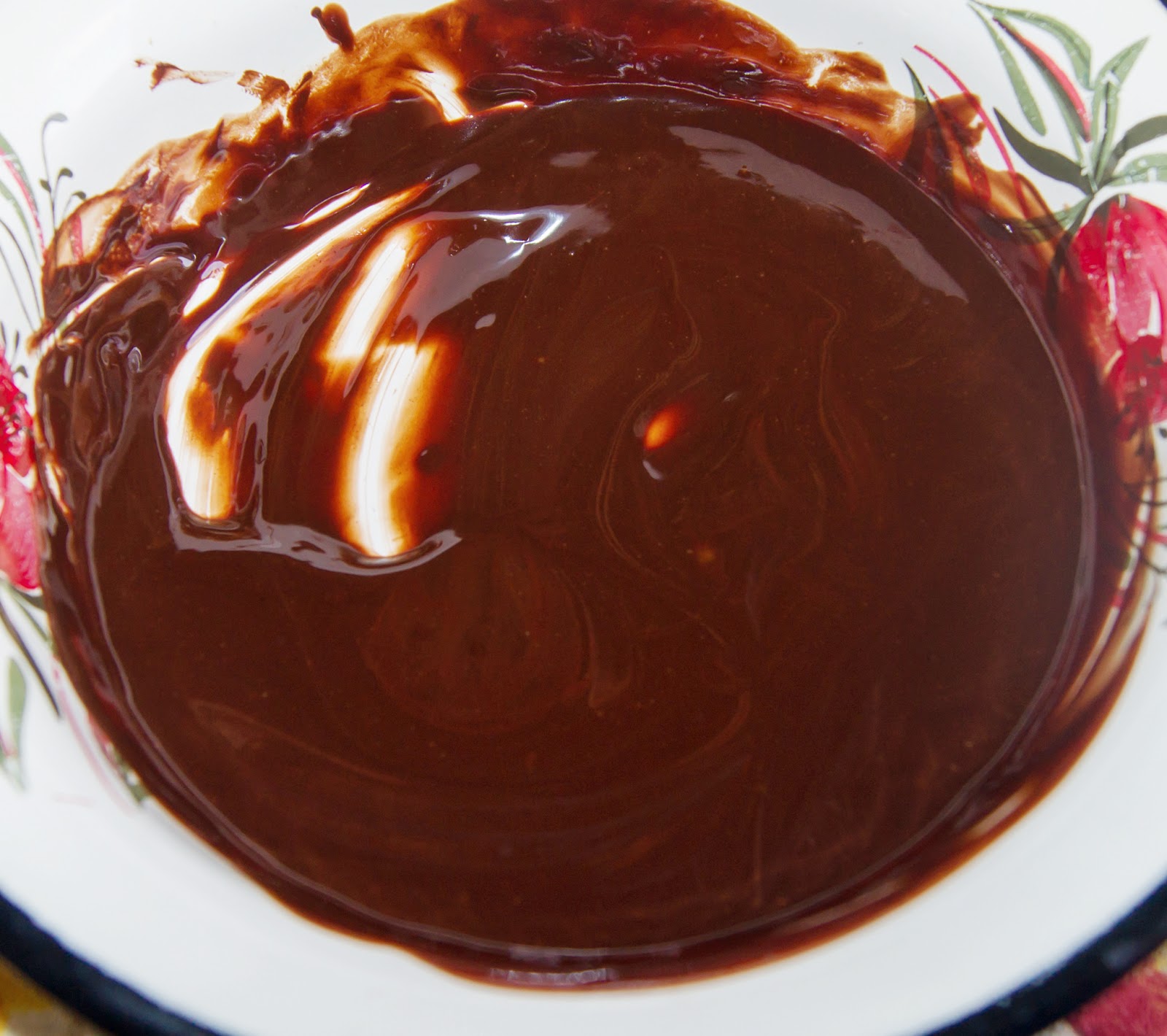 4. Распустить шоколад на водяной бане, затем снять с огня и добавить несолёное сливочное масло.  Размешивать до получения однородной массы.
