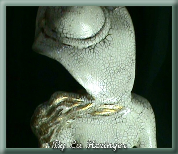 Возьмите гипсовую заготовку. - Нанесите 3 слоя грунта - ожидание высыхания между слоями. - Примените двух шаговый кракелюр - После того, как 1 шаг высох, применяют 2ой шаг.. - По достижении желательных трещин вотрите в них смесь: немного воска + немного чистого битума. Хорошо перемешайте, чтобы смесь была однородной. Нанесите на статуэтку. - Дайте высохнуть 10 минут и удалите излишки с помощью мягкой ткани. - Слегка смочите чистую ткань в скипидаре и пройдитесь удаляя все излишки воска. - В некоторых местах применяйте золотой воск,чтобы сделать акценты на выступающие места.. Не переусердствуйте, ладно? - Теперь можно отполировать изделие мягкой тканью. - готово!