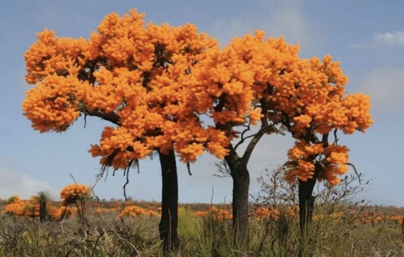 Между прочим, главные рождественские растения в Австралии вовсе не хвойные, а ремнецветниковые. Просто в канун Рождества, в самой середине австралийского лета, на материке начинает цвести нуитсия - рождественский цветок. Ее-то и наряжают к празднику.