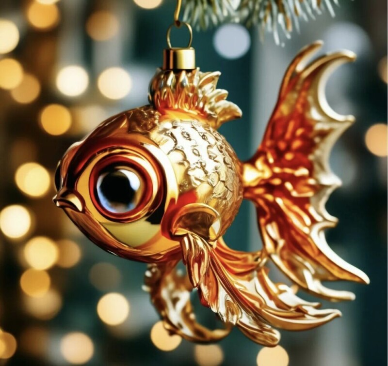 Яблоки и конфеты – да, рыба – сомнительно, все таки она скоропортящийся продукт, а в Европе лютых морозов нет. А вот золотая рыбка – вполне себе сказочный персонаж. И, конечно, в золотую рыбку вкладывают именно сказочный смысл, она как джинн, который исполняет желания. Так что для тех, у кого есть самое сокровенное желание, не лишним будет повесить на елку Золотую рыбку.