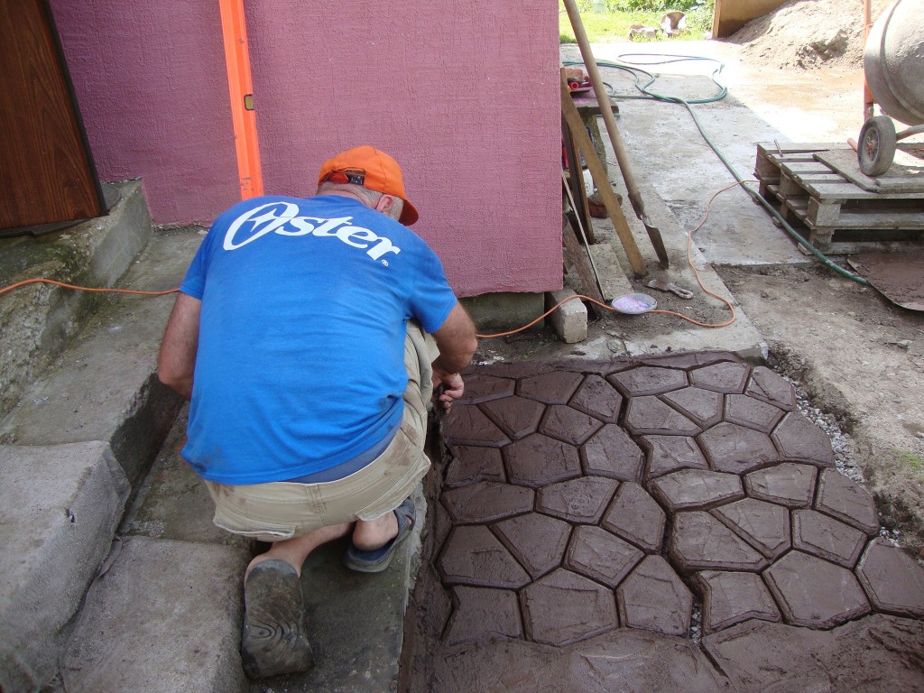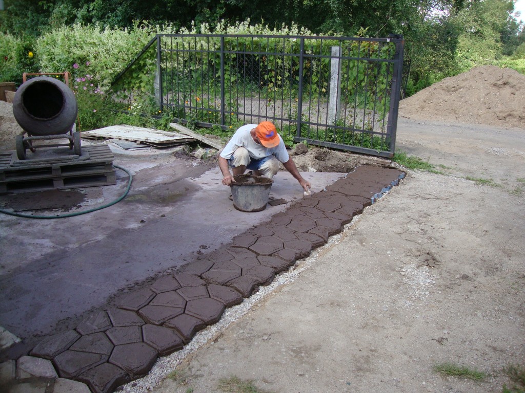 Пропорции следующие:3 части песка+1 часть цемента,развести водой постепенно до густоты домашней сметаны.Под плиты:нужно убрать дерн,глубина примерно 10 см,не больше,а то надо много подсыпки делать,мы сыпали песчано-гравийную смесь.Когда форму залили,минут через 7 надо уже снимать.Поэтому мы купили 2 формы.Пока одна сохнет,вторую заливают.Делать естественно надо в солнечную погоду.Пару дней не ходить.А когда площадка готова,то выдерживает вес машины.(джип).Если делать дорожки,то дерн снимать 5 см.,а потом все по схеме как площадка.