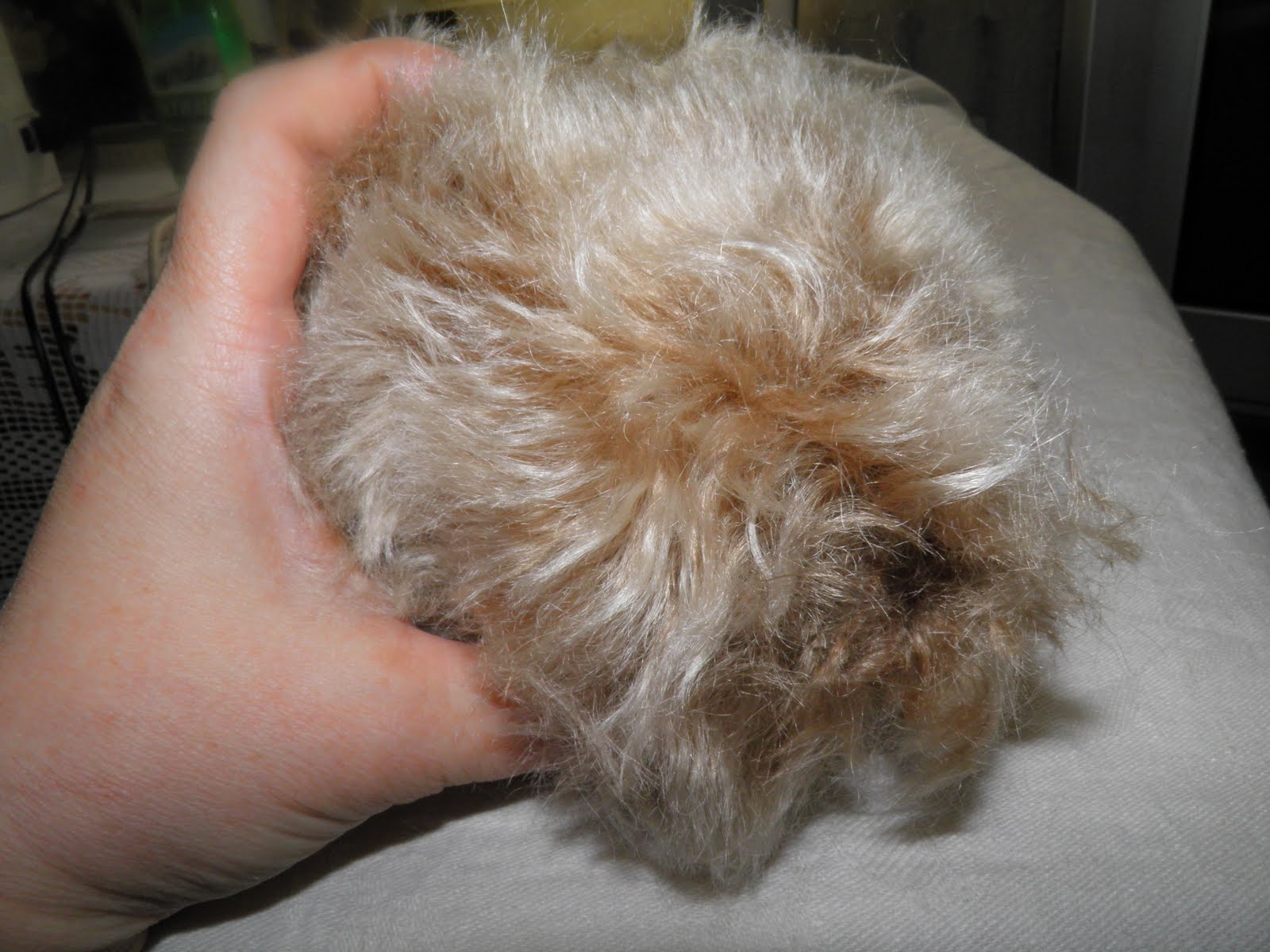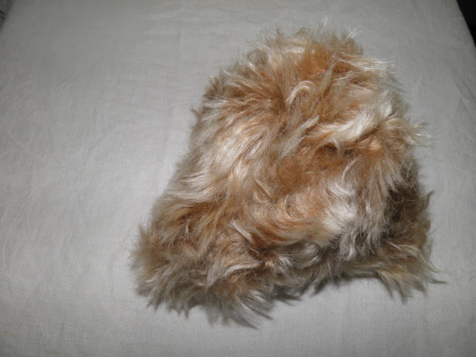 Итак,выбираем цвет шерсти.Тут дело вкуса-но есть тонкости.Если цвет шерсти в точности совпадает с цветом меха-супер.Но если нет,я раскладываю шерсть,сверху ложу мех-и выбираю наиболее удачное сочетание.Были промахи-как то шила мишку,оттенок шерсти был сизоваый-ну и кордачес подобрала такой же-в итоге мишка получился с синеватой ряшкой))))-так что если конкретно не в цвет-выберите контраст-белый.Стопроцентное попадание.Очень хорошо,когда цвет моськи белый-и белый наряд.