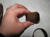 5.Намечаем нос.Для этого беру шерсть,сворачиваю ее в виде прямоугольника и приваливаю к месту носа.Приваливаю не до конца,слегка,только очерчивая контур шнобеля.