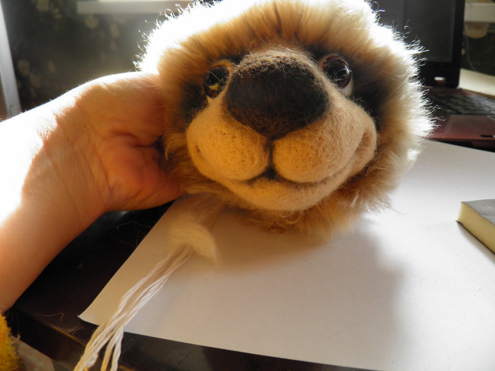 6.Отрываем по кусочку кордачеса и начинаем обваливать всю моську равномерно вокруг носа.И с этого момента все время проверяем симметричность нашей набивки.Если кто занимался скульптурой(помнте лепку головы)-проверяем симметричность по 4 точкам-смотрим на макушку,смотрим фас,смотрим со стороны подбородка и профиль.Используем среднюю иголку.Не бойтесь,если вам покажется что слишком большие дырки от иголки-они уйдут,да и дорабатывать мы будем тоненькой иголочкой.