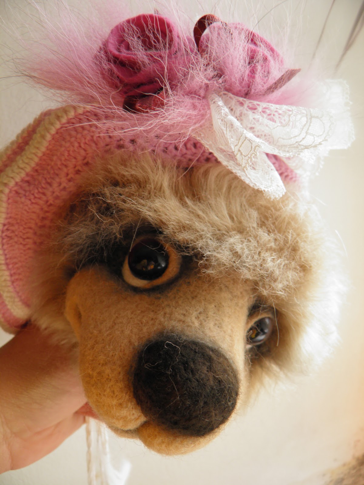 Хочу сказать,что валянию(по правильному-фильцеванию)ни у кого не училась-доходила сама с пом.инета (храни его Господь),практики,интуиции ,ну и небольшого навыка.Первая валянная моська получилась как в пословице:"Не было бы счастья,да не счастье помогло"-ну никак не удавалось мне красиво выстричь носик. В очередной раз испортив кусок дорогущего мохера стало жалко денег)))-и придумалось прикрыть позор шерстью.Ну и пошло-поехало.И теперь уже и выстричь умею как положено-а валянные моськи не отпускают)))