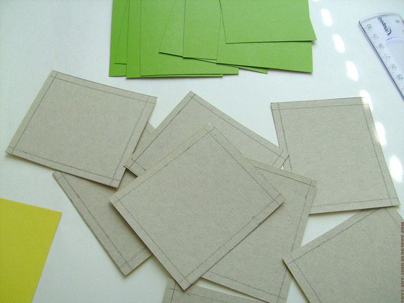 Теперь беремся за наши остатки от картона. Полосы разрезаем на маленькие прямоугольники, у меня получились размером 4,5см х 2,5см, 4,5см х 3см, 4,5см х 4см. Всего 19 штук, это будут наши ценники.