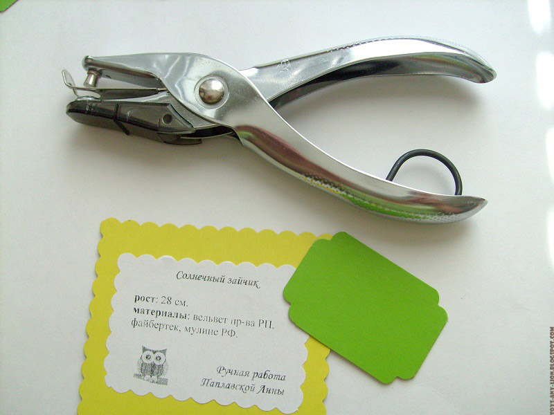 Теперь нам надо сделать отверстие в бирке и ценнике и повесить все на игрушку. Для этого я использую дырокол на одно отверстие. Купила его пять лет назад и очень рада, постоянно выручает, когда попадается папка с нестандартным креплением или как в данном случае. Если такого дырокола нет, можно попробовать воспользоваться небольшим обычным дыроколом, или просто взять шило (толстую иголку) и проколоть отверстие.