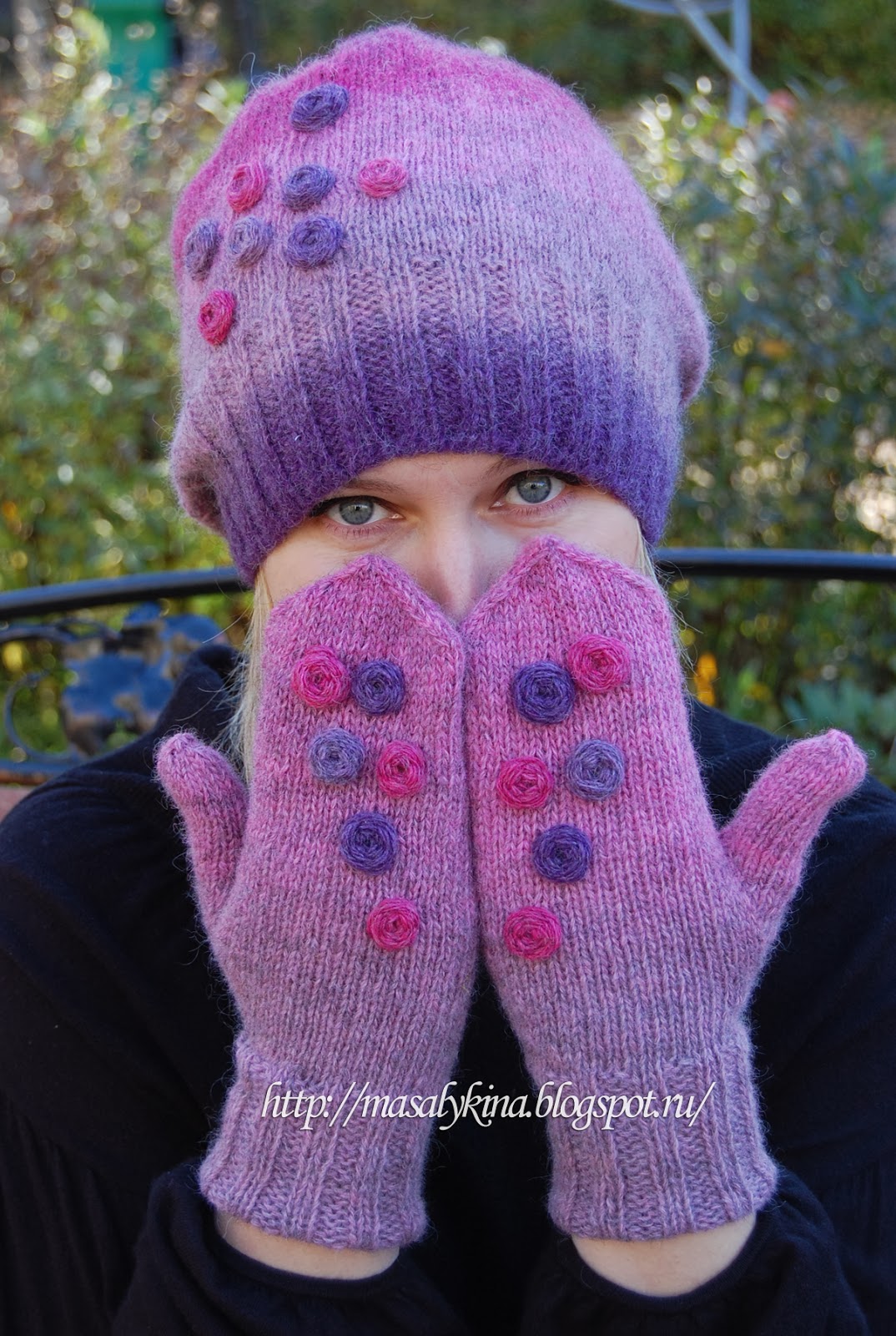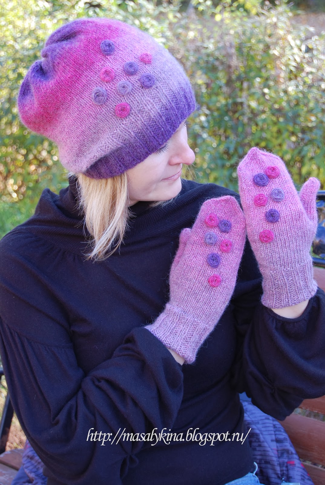 Помните мой Зеленый комплект , который мне пришлось отдать...? Горевала я не долго поэтому поводу, всего пару-тройку дней. В замен ему на днях был связан новый, но другого цвета. Никогда не могла бы подумать, что такие оттенки мне к лицу)) Нитки Кауни 8/1 Pink-lila, спицы №2,5 и 3, вес шапки 65 грамм , вес варежек 50грамм. Вязалось в 3 нити от одного клубка. Все таки кауни не устает меня удивлять, была бы еще она помягче, цены бы ей не было)). Из-за большого скопления в доме разных шапочек, беретиков и тому подобных вещиц, было решено отправить этот "Ягодный смузи" продаваться в МОЙ МАГАЗИН . А на Ravelry у меня тоже есть картиночки этого комплекта.
