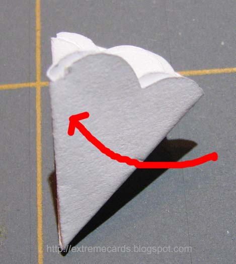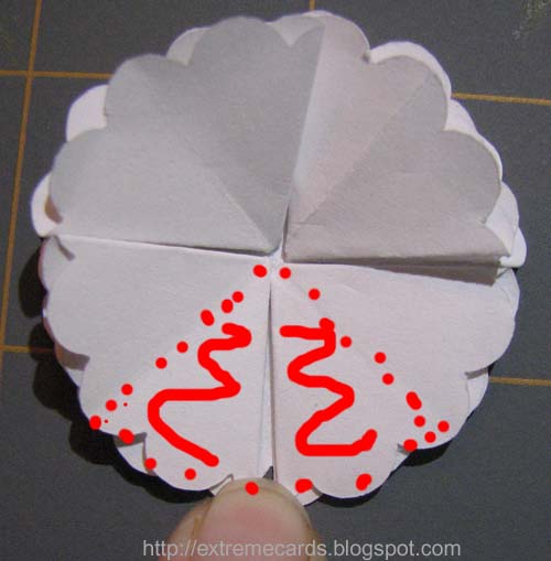 Fold the flower into eighths, but not by folding the entire thing in half again, it's too thick. Fold one loose layer back on itself, then flip the flower over and fold the other loose layer back on itself.