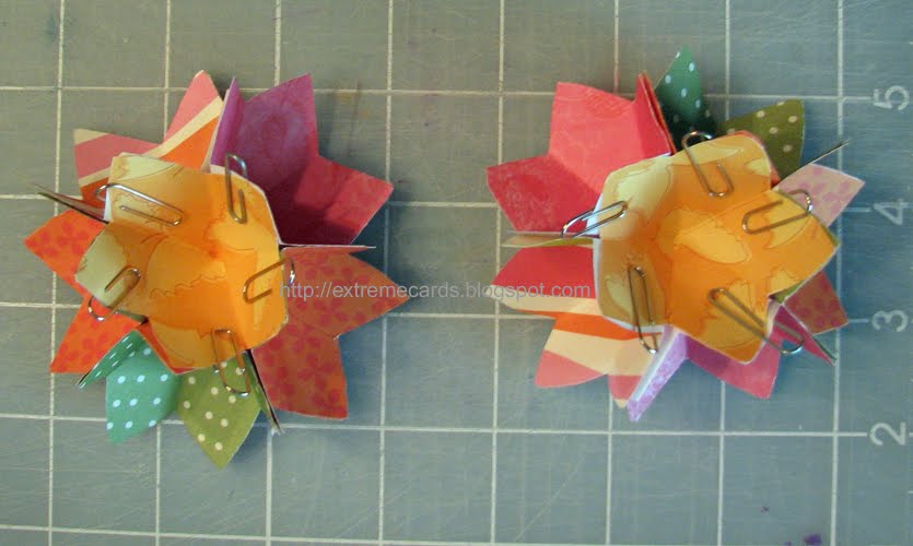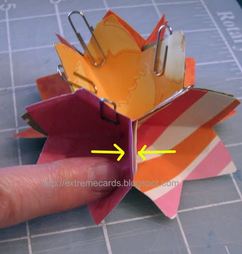 Start with 8-petal flowers, like the ones used for the seven-flower pop up card. However, instead of cutting out one petal, cut out two. Overlap the cut edges and glue together to make 5-petal, cup shaped flowers.