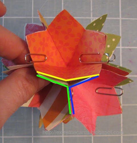 Designate one flower as the "top." Mine is yellow. Select 5 flowers. Line up one petal of each to the five petals of the top flower. Glue.