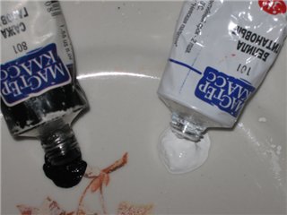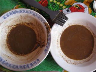 Даю смеси отстояться. На дне образуется густой осадок им будем рисовать коту полосочки. Аккуратно разделяем смесь, верхний слой нам нужен для основного тона, его еще развожу водой, чтоб при нанесении цвет бежевый получился.