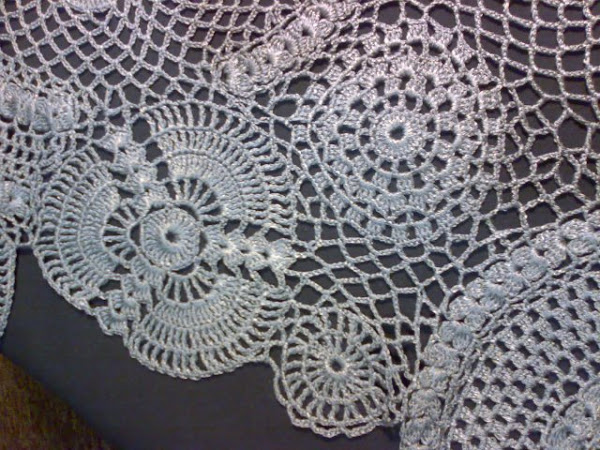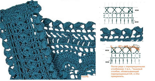петли, 4 столбика с2 накидами в арку между столбиками с 3 накидами, 3