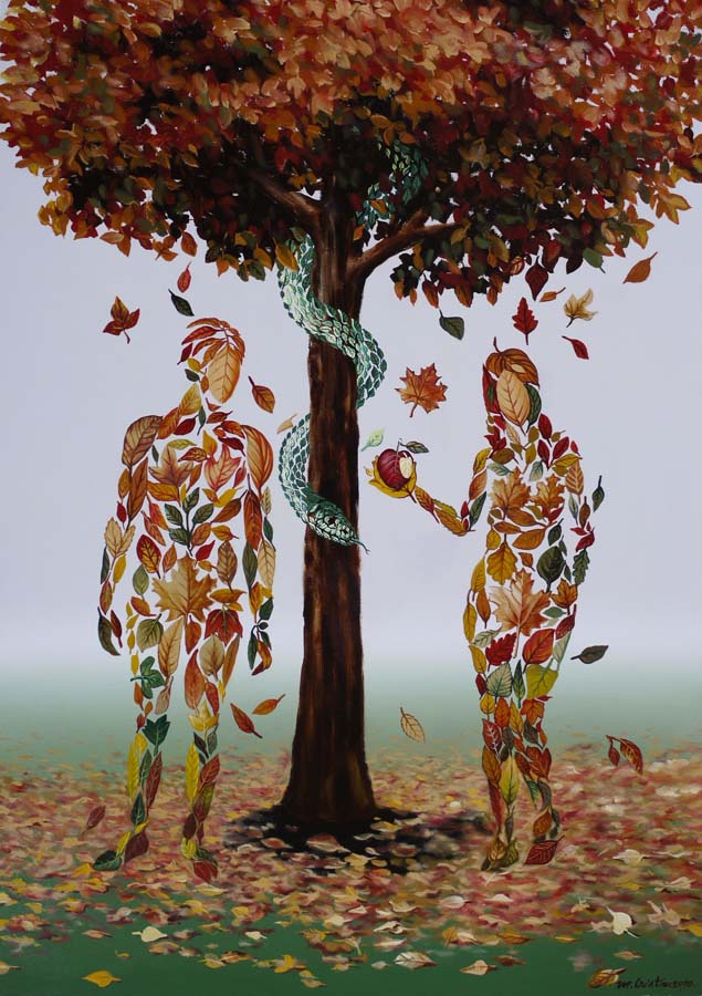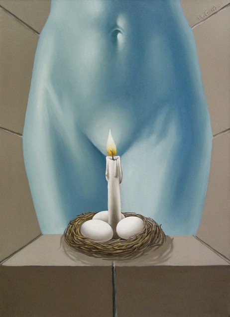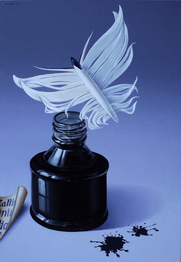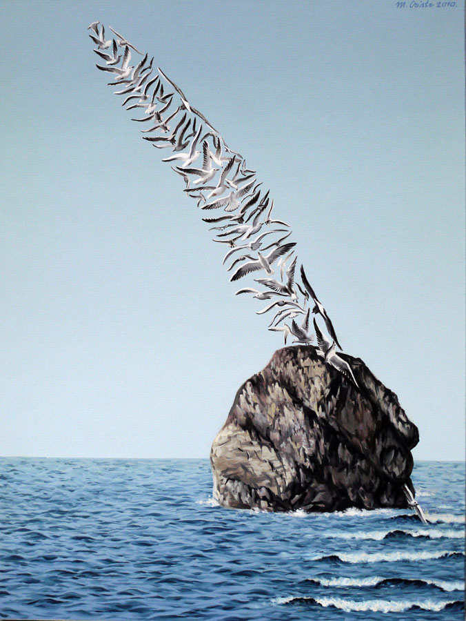 Попался мне на глаза талантливый румын - Михай Кристе (Mihai Criste). Художник - сюрреалист. Если и есть у него тараканы в голове, то они упорядочены, передвигаются с умом и аккуратностью. По сюжетам видно, что Михай Кристе (Mihai Criste) любит природу, потому что некоторые картины представлены, как в макросъемке у натуралистов - фотографов. Он постоянно обращается к теме Вечности и Первородного Греха. А как он тонко и точно похоронил бабочек, произнося перед этим речь: "Теперь я видел в гробу ваше Золотое Сечение". А его руки с пером в виде чаек или покосившейся мачты корабля? Не до конца застывшее время, в виде лодки и весел с часовыми стрелками, но все еще в надежде горящей свечой! А влюбленная пара из осенних листьев!