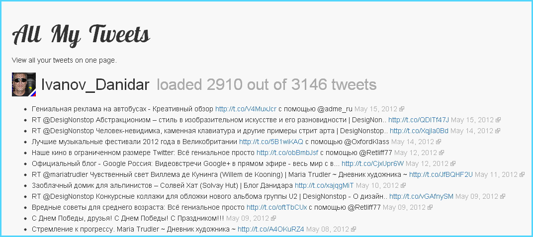 Я, конечно, немного слукавил в заголовке статьи – все твиты на одной странице, потому что если у вас уже больше 3200 твитов, то о конечном продукте, как «все твиты», даже и не мечтайте. Вернее лукавлю не я, а лукавят разработчики. Откуда взялась такая цифра, от чего отталкиваются создатели подобных сервисов, манипулируя таким значением – загадка. И естественно до первого твита вы уже никогда не доберетесь, если их количество превысило этот барьер и все твиты будет понятием относительным.
