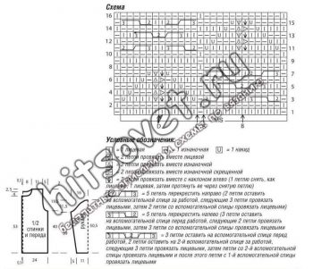 Оставшиеся по 27 петель плеч закрыть через 59,5 см или 146 рядов от начального ряда.