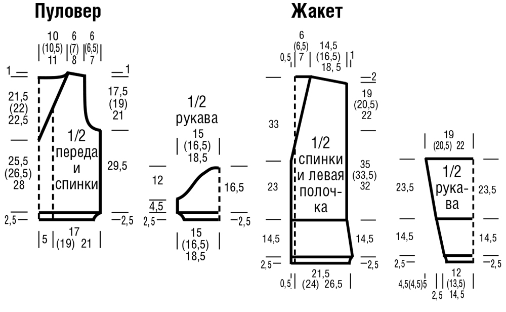 В связи с различными узорами на спинке меньше петель, чем на переде; их ширина, однако, одинакова. В высоту данные в см рассчитаны по плотности вязания изнаночной глади.