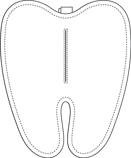1) Вы скачали новую и улучшенную модель и напечатал его два раза в натуральную величину (без масштабирования) размера . Вырежьте зубы и щеки форму, если вы хотите их использовать. Вырежьте большой кусок тела зуба от одного листа, и карман кусок от другого листа.Также пробить небольшие отверстия в основной части шаблона, чтобы отметить ленту размещения, ротовой щели, верхние углы кармана размещения и глаз. Я использую 1/8 дюйма дырокол и он прекрасно работает.