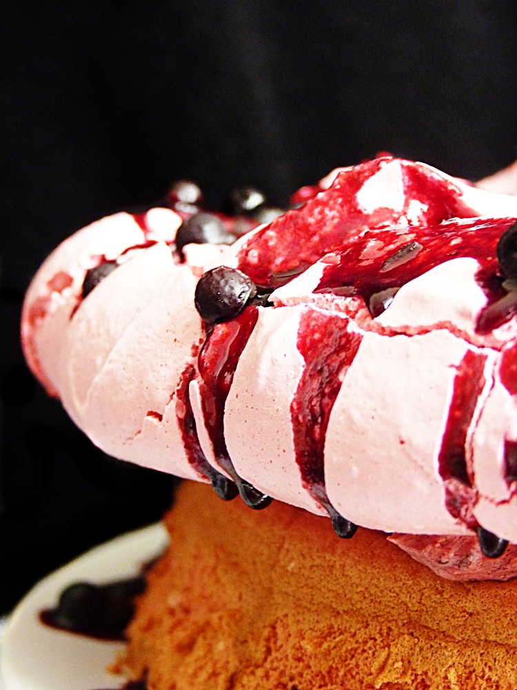 Бисквит, ягодный крем, пена с безе, поливка из ягод.