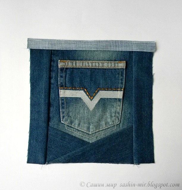 1) Для начала обозначьте вокруг кармана прямоугольник. Часть Е прикладываем под углом к нижней части кармана. Намечаем полоски, складываем две части, скалываем и притачиваем. Отрезаем лишнее и проглаживаем.