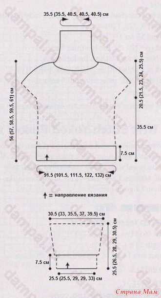 Нижний край переда и спинки вяжутся резинкой отдельно прямыми и обратными рядами для образования боковых разрезов. Затем вязание продолжается круговыми рядами до начала проймы.