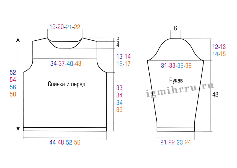 Рукав: набрать 57/59/61/63 п. Связать 12 р. ажурной планкой, начиная с 3 лиц. вместо 2/как в описании/с 3 лиц. вместо 2/с 3 лиц. вместо 2. Затем связать 0/2/4/4 р. лиц. гладью. Далее вязать: 15/16/17/18 п. лиц. гладью, 27 п. ажурным ромбом, 15/16/17/18 п. лиц. гладью (в 1-м р. связать 16/17/18/19 лиц., 1 накид, 2 п. вместе лиц., 21 лиц., 2 п. вместе лиц. с наклоном влево, 1 накид, 16/17/18/19 лиц.). Через 5,5 см = 20 р. от наборного края прибавить с обеих сторон 9 х 1 п. в каждом 10-м р., 4 х 1 п. в каждом 8-м р./5 х 1 п. в каждом 10-м р., 9 х 1 п. в каждом 8-м р./10 х 1 п. в каждом 8-м р., 7 х 1 п. в каждом 6-м р./20 х 1 п. в каждом 6-м р. = 83/87/95/103 п. Через 42 см = 142 р. от наборного края для оката рукава закрыть с обеих сторон в каждом 2-м р.