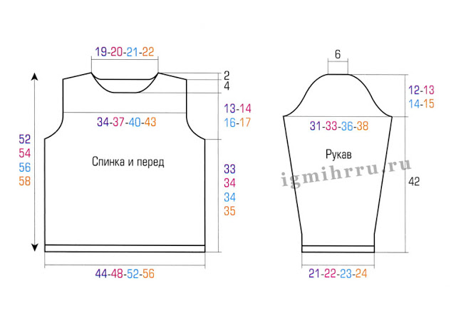 Перед: вязать, как спинку, но с более глубоким вырезом горловины. Для этого через 46/48/50/52 см = 160/168/174/182 р. от наборного края закрыть для выреза горловины средние 21/23/25/27 п. и вязать далее раздельно, закрывая по краям выреза в каждом 2-м р. 1 х 4 п., 1 х 3 п., 2 х 2 п., 2 х 1 п.