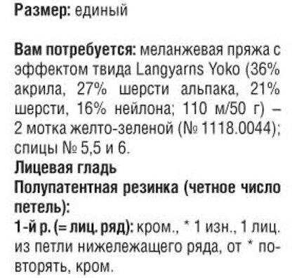 Неоднородная пряжа цвета созревающего лимона деликатно украшена пестрыми крапинками. Легкий твидовый эффект не выходит на первый план, но при этом делает цвет более интересным, а созданные модели уникальными. Шерсть альпака придает ниткам объем и мягкость - идеальный вариант как для одежды, так и для аксессуаров. Модная шляпа боб декорирована узором из "кос". Что касается пуловера, его отличает лаконичный дизайн: лицевая гладь разбавлена тонкими полосами платочной вязки и подчеркнута по краям резинкой.