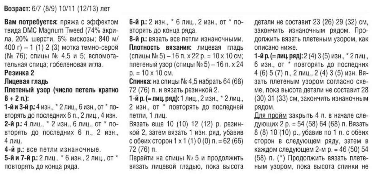 В рецепте классического пуловера нет ничего сложного: возьмите грубоватую на вид, но очень мягкую пряжу с эффектом твида, в составе которой акрил, шерсть и вискоза, добавьте структурные узоры и не поленитесь выполнить проймы и окат на рукавах для анатомической посадки. Верхняя часть модели связана плетеным узором, нижняя - лицевой гладью. Бейка горловины, нижняя планка и манжеты оформлены обычной резинкой.