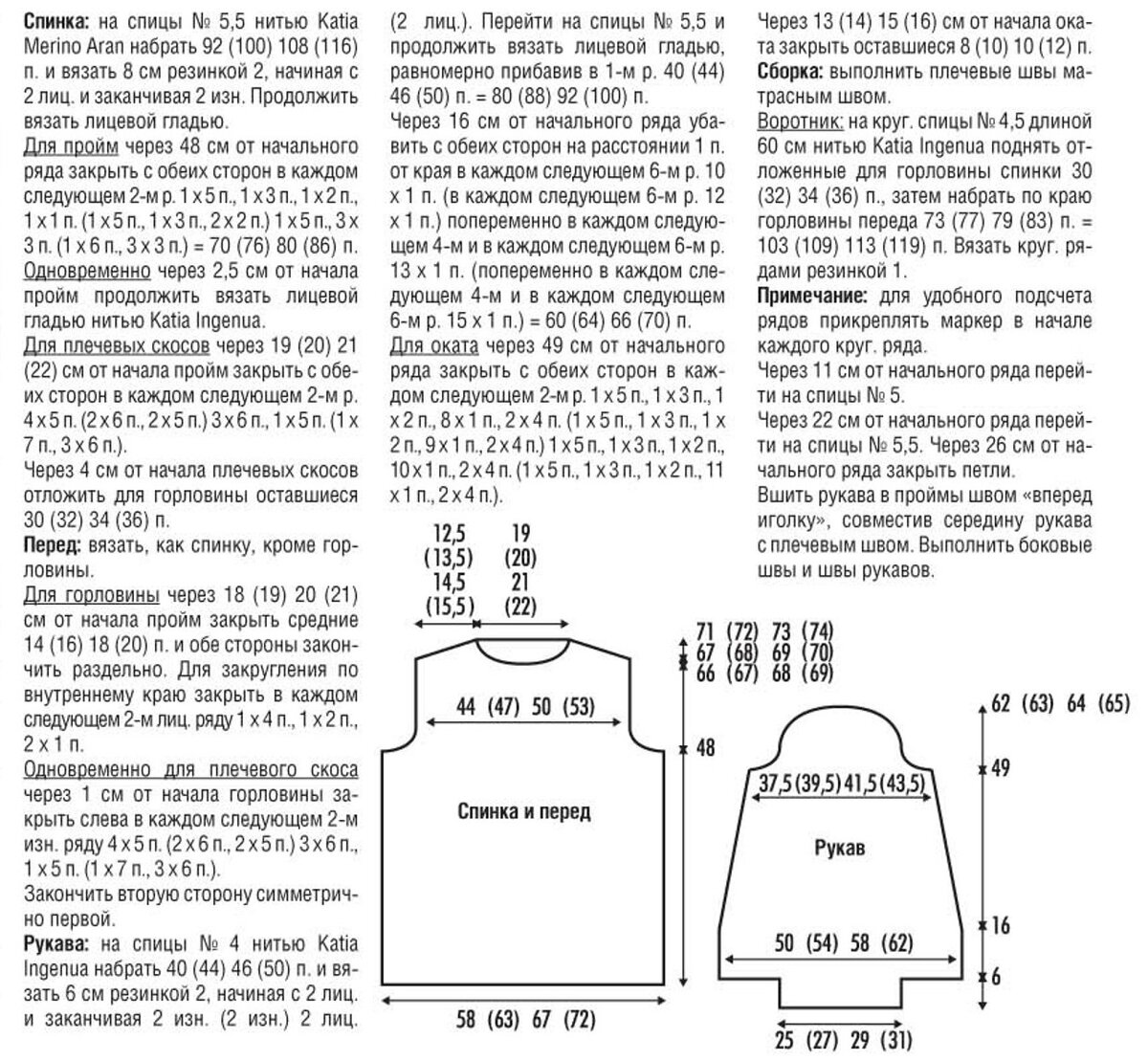 Необычное сочетание двух видов пряжи делают модель простого фасона исключительной. Большая часть переда и спинки связана из смеси мериносовой шерсти с акрилом, верх пуловера вместе с объемными рукавами приобретает соблазнительную полупрозрачность благодаря тонкой мохеровой нити. Основным узором здесь выступает лицевая гладь. Нижние края отделаны широкой резинкой, а для высокого воротника гольф использована более плотная.