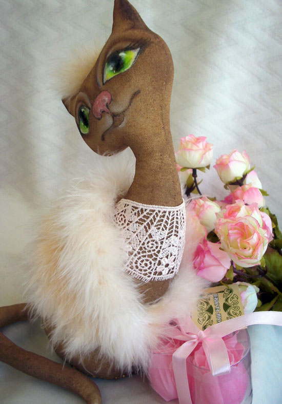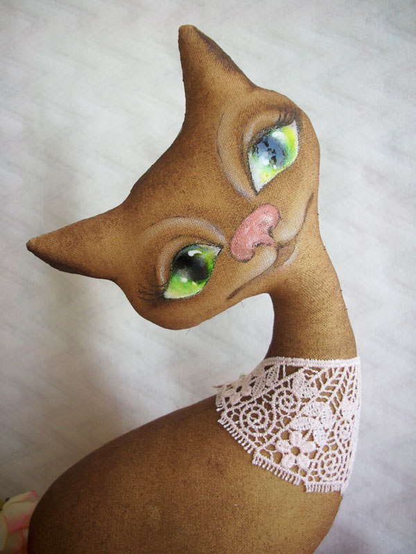 Кот сшит из бязи, тонирован кофе, роспись акрилом.