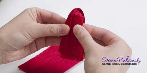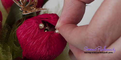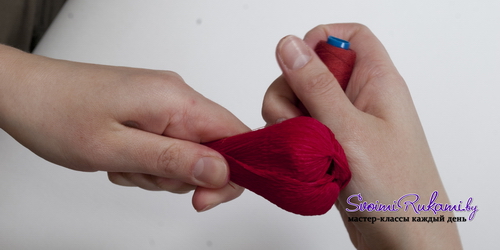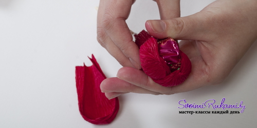 Поочередно прикрепляем лепестки, фиксируя их ниткой в цвет гофры, чтобы цветок не рассыпался.