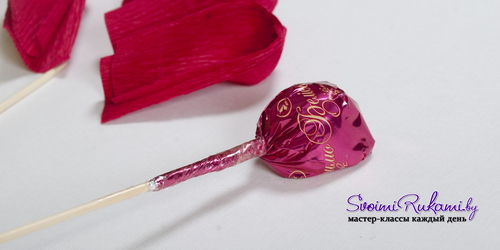 Укорачиваем шпажку примерно наполовину. При помощи скотча закрепляем на шпажку конфету.