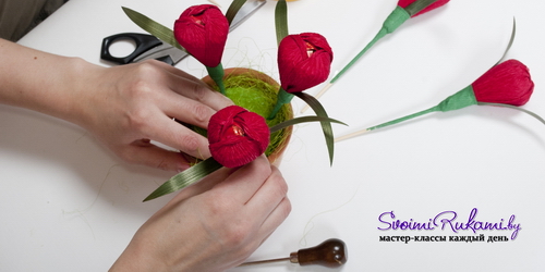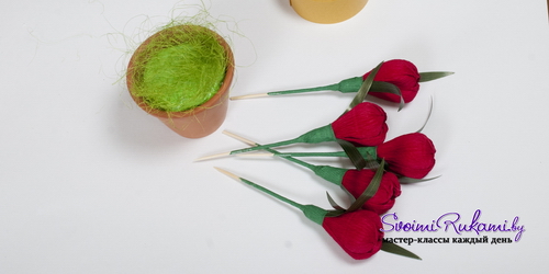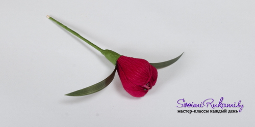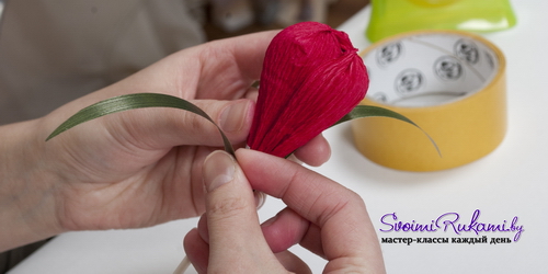 Из оформительской бумаги вырезаем по два листочка на каждый цветок. Прикрепляем листочки к бутону.