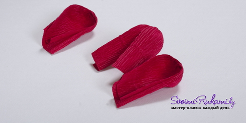 Из гофры нарезаем полоски шириной 4 см, длиной -17 см. На изготовление одного цветка понадобится 3 полоски.