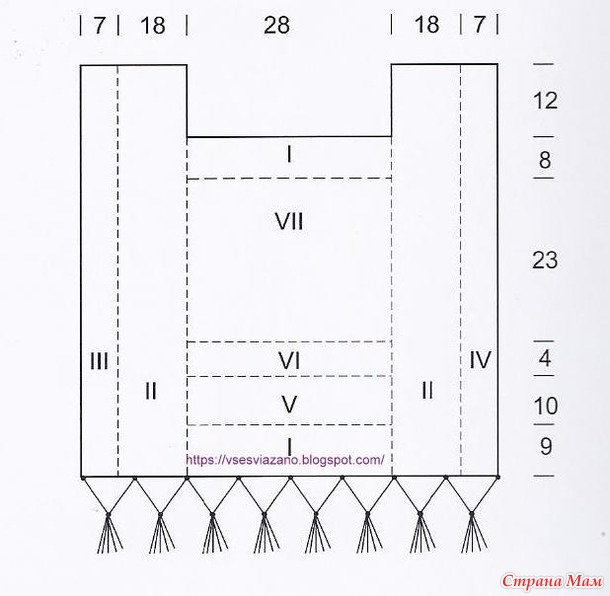 ПЕРЕД И СПИНКА вяжутся одинаково. Для переда наберите 122 петли . В центре работы вяжите 44 петли по схеме I. По краям по 29 петель вяжется по схеме II, а самые крайние 10 петель с краев вяжите по схеме III (слева) и IV (справа).