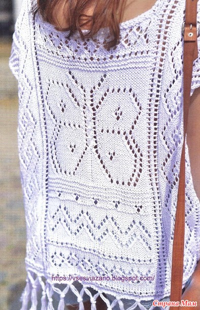 Только глянь: любимый многими вязальщицами узор "Бабочка" - а связать по этой идее можно хоть короткий кроп-топ, хоть топ подлиннее, хоть пуловер летний ( добавив рукава тем же узором! ), а если удлинить выкройку до нужной тебе длины - хоть на две ладони выше колена, хоть до пола - получится дивная туника или домашнее ( или дачное) чудесное платье к лету! Такой вот простор для твоей фантазии! Поройся в закромах (а хлопок есть в запасах всех Вязальщиц), или распусти, как вариант, что-то ненужное и свяжи вот такую очень нужную к лету красоту!