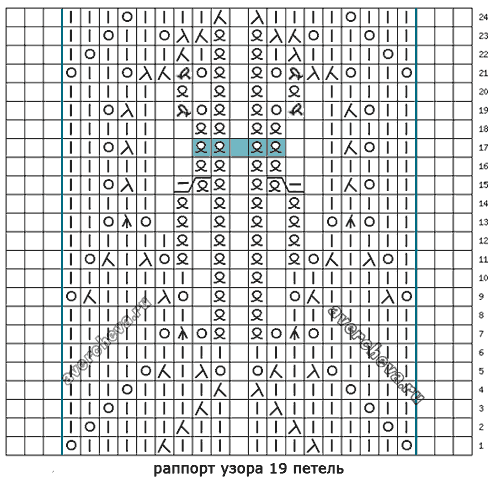 В схеме указаны лицевые и изнаночные ряды. Раппорт узора 19 петель в ширину . В высоту повторяем с 1-го по 24 ряд.