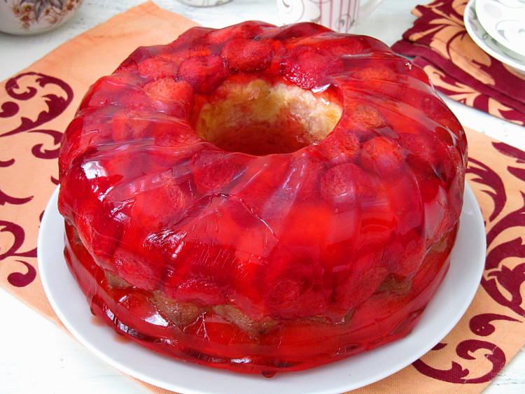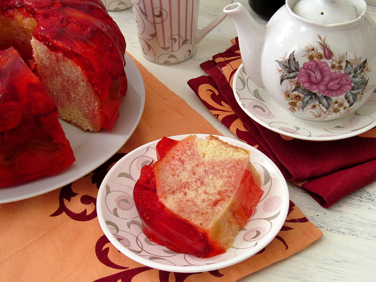 *Если вы делали кекс в металлической форме, то опустите ее секунд на 15-20 в миску с горячей водой, тогда желе чуток подтает и кекс легко "выпрыгнет". Я готовила в силиконовой форме, и перед тем, как заливать желе немного сбрызнула ее водой, в последствии желе само хорошо отошло от стенок и кекс я достала без проблем)))