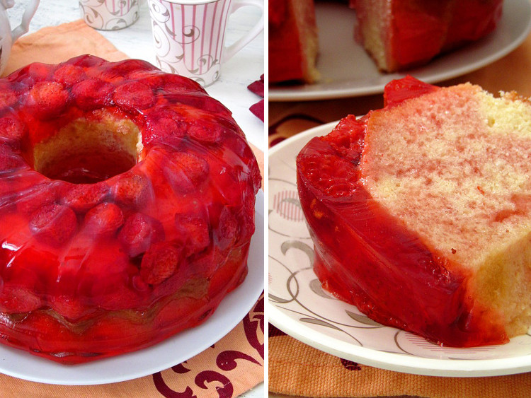 1 пачку желе развести в 250 мл. кипятка, остудить и вылить в ту форму, в которой выпекался кекс (только чистую естественно).