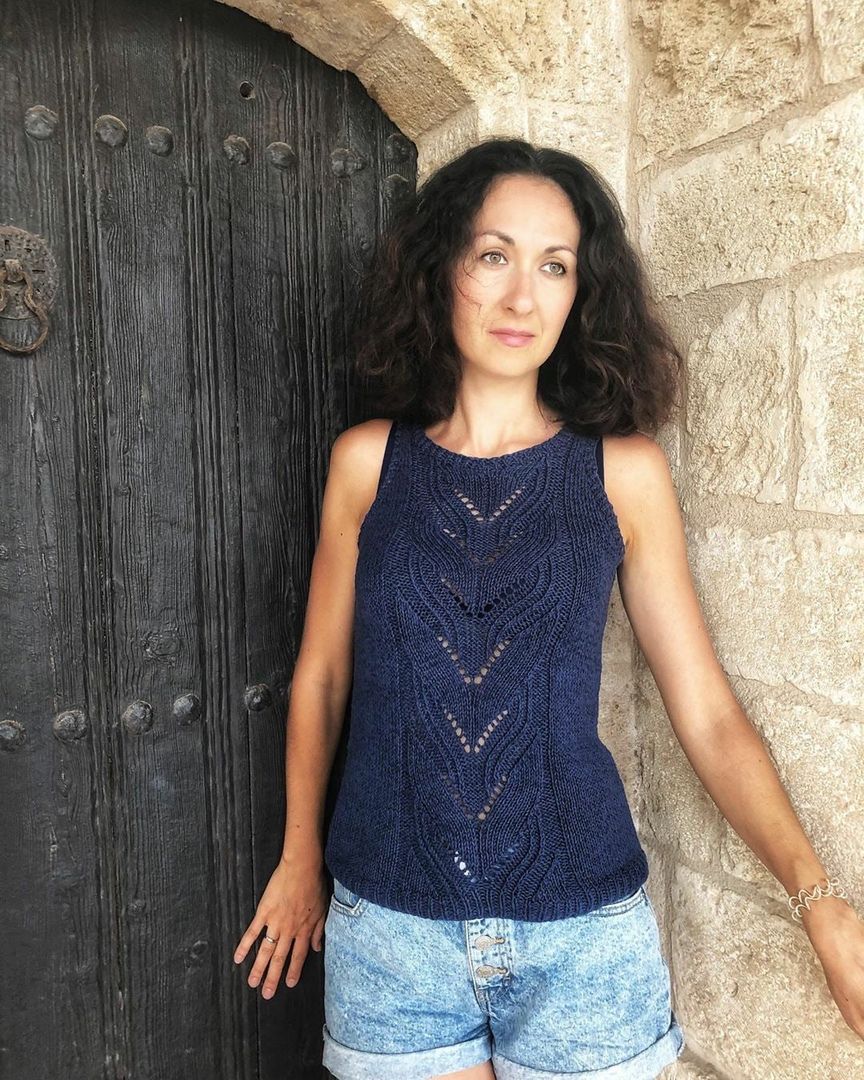 Для отделки пройм, по кругу набираем 84 петли и вяжем 5 рядов резинкой 1х1, закрываем петли любыми эластичным способом.
