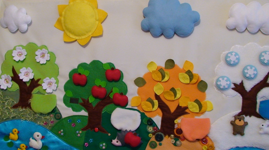 Что касается жителей на плакате, то весеннем сюжете - маму утку с утятами (на кнопочках, кнопочки нашиты на речку). Рыбки просто плавают в речке. На летней полянке живёт ЁЖ с липучкой на спине, собирает яблоки (на него помещается только 1 яблочко с дерева). Ёжик сам тоже на липучке под деревом. На зимнем сюжете - белый заяц и мишка ( на липучках).