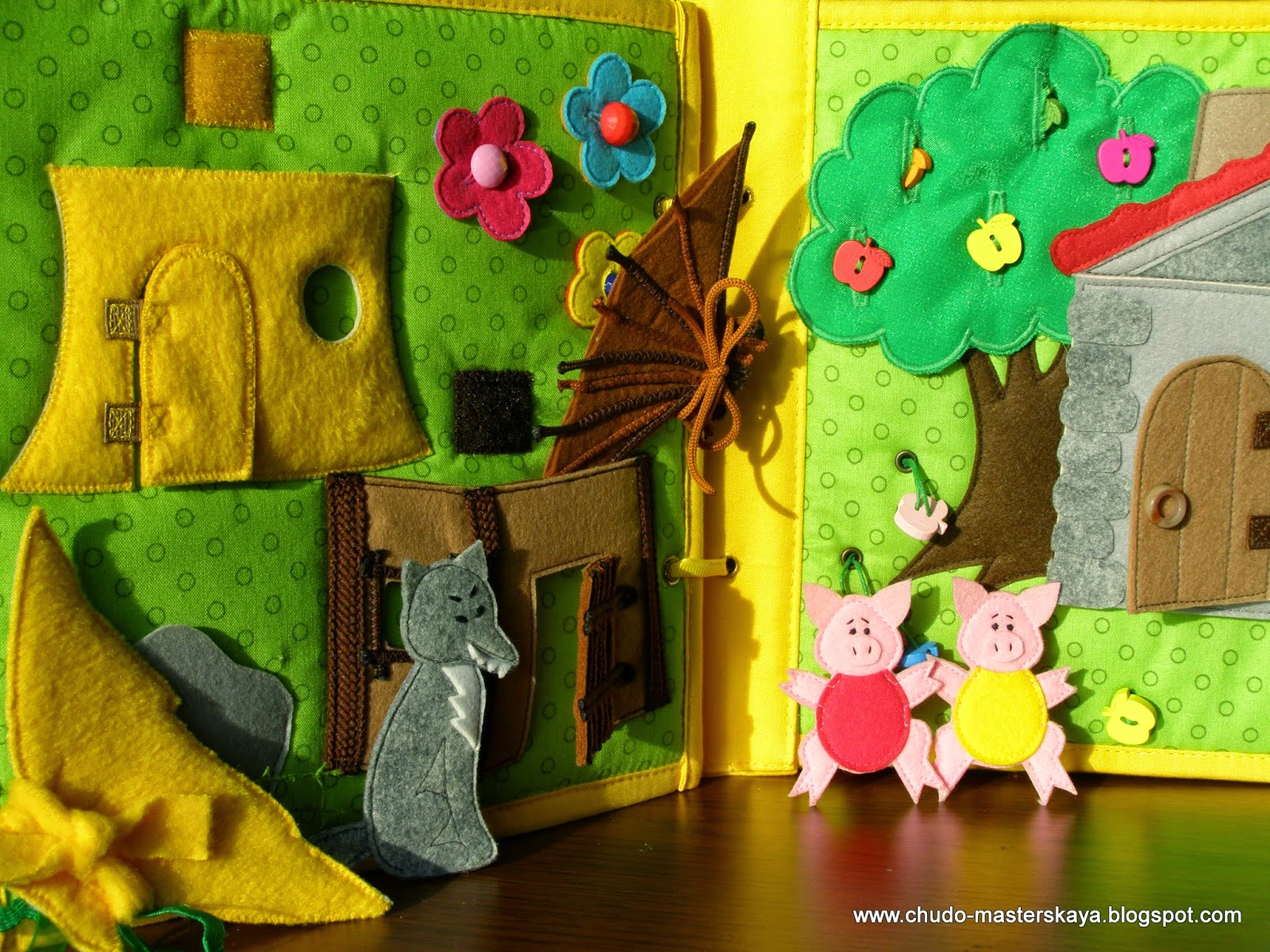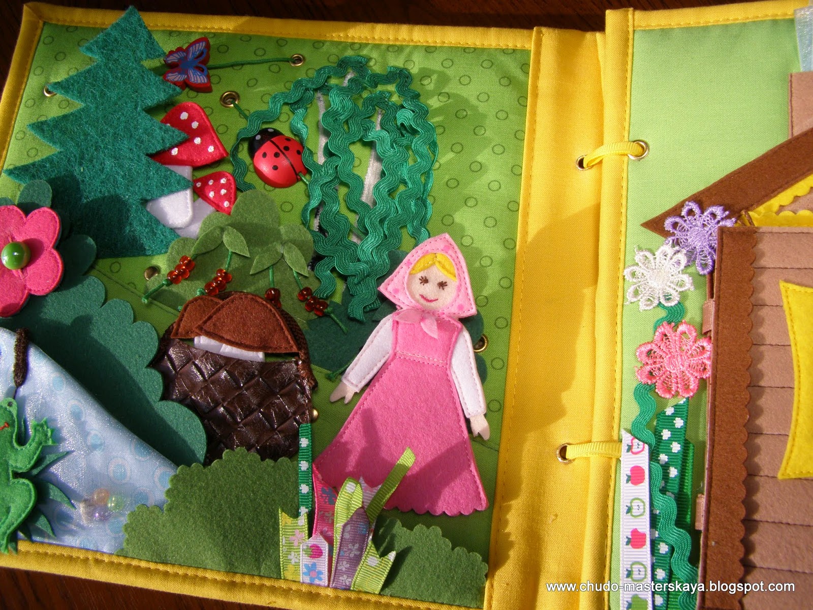 Мама Полиночки подчеркнула, что ей нравится использование разнофактурных материалов в развивающей книжке. Поэтому, где это было возможно, я старалась заменить фетр на другие материалы: ёлочка- жесткая губка, озеро - гладкая органза, кружевные цветочки у дома, рельефный кожзам, мешковина в домике Сороки, креп-сатин на деревьях разной стороной.