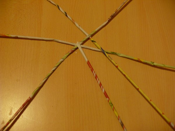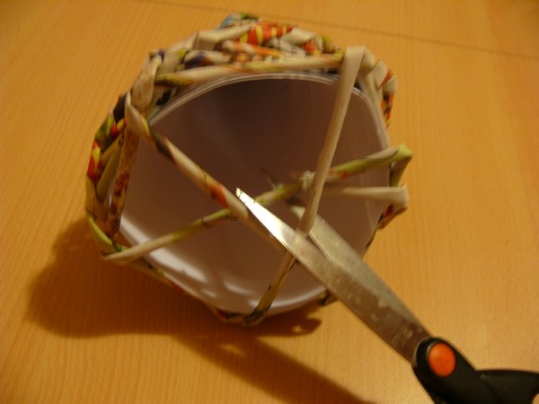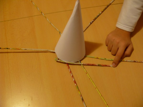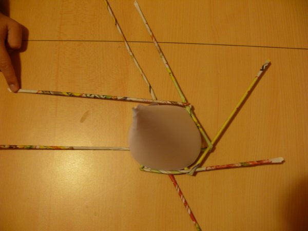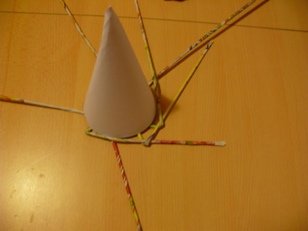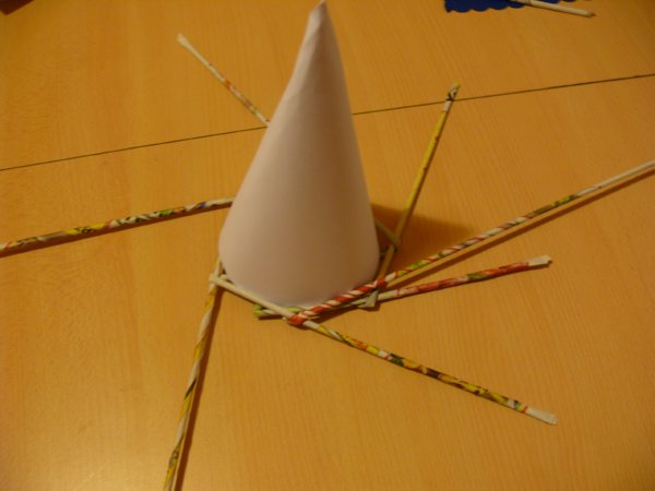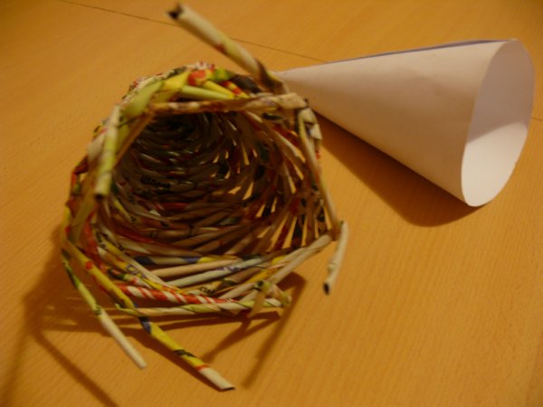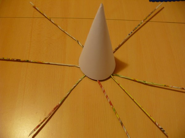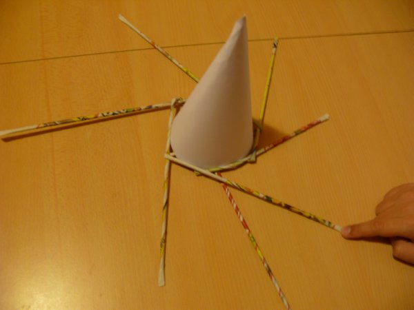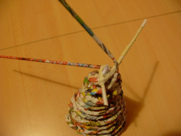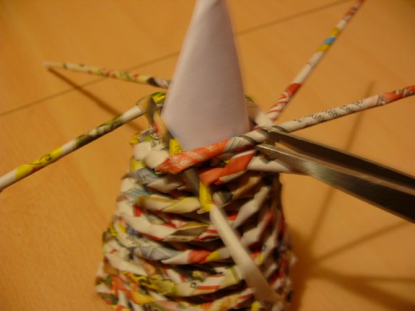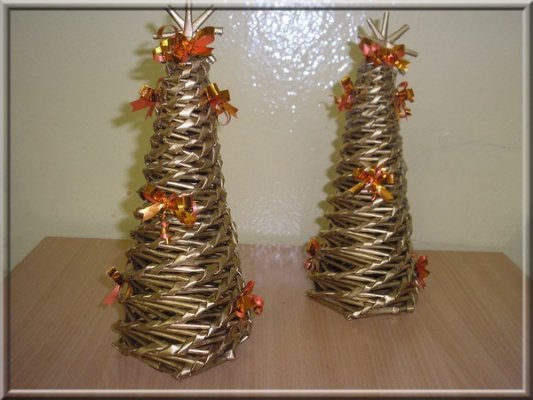 Сначала я сплела конус косым плетением из газетных трубочек, потом покрыла его белой грунтовкой, затем зеленой краской. Ну и сверху вниз в шахматном порядке приклеила шарики.